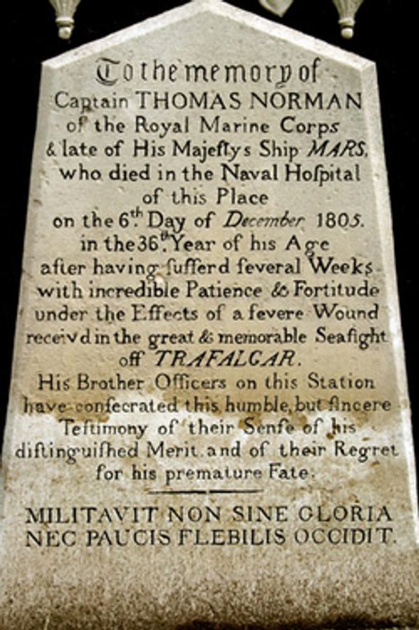 The Southport Ditch Cemetery was used for interments between 1798 and 1814, after which it fell into disuse. The only exception was the grave from 1838 at the northeast corner of the cemetery, near Prince Edward's Gate. The renaming of the graveyard to commemorate the Battle of Trafalgar apparently did not occur until many years after the victory. Only two of the interments are of those who died of wounds sustained during the battle. One of the victims was Captain Thomas Norman of the Royal Marine Corps and HMS Mars, who died in the Naval Hospital on 6 December 1805 at the age of 36. The other was Lieutenant William Forster of HMS Colossus, who died of the wounds that he received in battle on 21 October 1805 at the age of 20. A plaque mounted by the Southport Gates reads: "Trafalgar Cemetery - Here Lie The Remains of Some Who Died of Wounds at Gibraltar After Nelson's Great Victory in October, 1805, Those Killed During The Battle Having Been Buried at Sea. Other Graves Date From 1798."